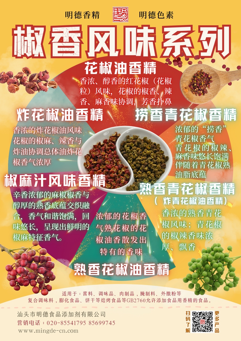 汕頭市明德食品添加劑有限公司的椒香風(fēng)味香精系列,涵蓋花椒、炸花椒、搗香青花椒、椒麻汁風(fēng)味、熟香青花椒及熟香花椒等多種類型。產(chǎn)品具有真實的椒香、麻香、辣香及油脂香特征,適用于醬料、調(diào)味品、肉制品、腌制料及復(fù)合調(diào)味料等B端應(yīng)用,助力工廠快速打造風(fēng)味豐富、層次鮮明的椒香產(chǎn)品。